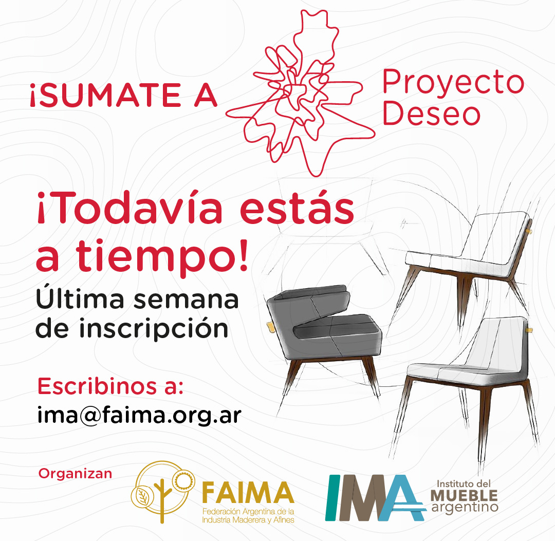 NÚMERO 12. 8 de mayo de 2024 | Informe mensual - sector Mueblero | En breve: En materia de comercio internacional, el sector mueblero es deficitario por USD 76 millones. Los principales destinos de exportación son Chile, Uruguay y Estados Unidos. Los de importación, China, Brasil y Tailandia. Para la amplia mayoría de las posiciones arancelarias, Argentina cobra un arancel a las importaciones mayor que cualquiera de sus principales socios comerciales. A su vez, hay menos competitividad en términos de costo impositivo. Reemplazar importaciones por productos locales y generar exportaciones es parte de una política de desarrollo que debe ser sistémica y sistemática. | Comercio internacional del sector de muebles | El sector de muebles experimentó un boom mundial como consecuencia directa de la pandemia de COVID-19, particularmente de la política de confinamiento que implementaron la mayor parte de los países. En Argentina ese crecimiento fue posible porque existe una importante industria local que pudo solventar esa demanda extra y no se vio entonces tan afectada como otros rubros por la caída en el comercio internacional (que impactó más en importaciones, en el caso argentino). Efectivamente, en nuestro país el sector de muebles y colchones abastece mayormente al mercado interno; obviamente, con la competencia de las mismas mercancías de origen extranjero. En 2023, del total de muebles comerciados con el resto del mundo (exportaciones más importaciones), el 82,2% fueron importaciones, por un valor de USD 97 millones. Así, las importaciones multiplican por 4,6 a las exportaciones; consecuentemente el sector arrojó un saldo negativo (déficit comercial) por USD 76 millones. En el informe analizamos el comercio internacional en el sector mueblero, la política exterior que se le aplica y las posibles fuentes de aumento de competitividad, dado el mayor nivel relativo de importaciones frente a las exportaciones. Podés descargar el informe completo acá: https://n9.cl/s13q6 | Como anunciamos la semana pasada, postergamos hasta el 15 de mayo el cierre de la inscripción al Proyecto. Todavía queda una semana para que te inscribas. ¿De qué se trata esta iniciativa organizada por IMA y FAIMA? En Proyecto Deseo te conectamos con un diseñador profesional o estudio para desarrollar el mejor prototipo posible. - Vas a tener el asesoramiento de IMA y FAIMA durante el desarrollo de tu prototipo.