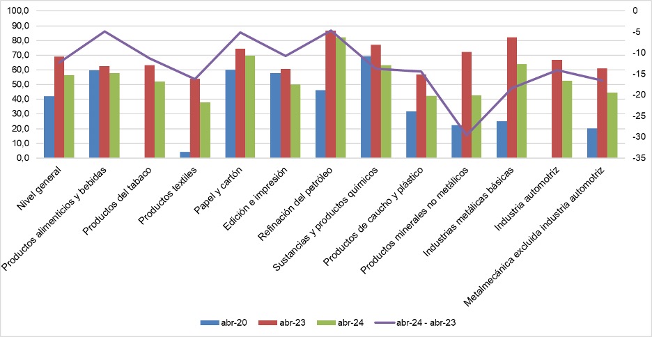 NÚMERO 18. 19 de junio de 2024 | COCKTAIL DE LANZAMIENTO DE PROYECTO DESEO | Con una gran concurrencia, el pasado 13 de junio, en La Maison Fontenla, celebramos el cocktail de lanzamiento de Proyecto Deseo. Fue una buena ocasión para conocernos en persona y celebrar esta unión entre empresas y diseñadores. Agradecemos a todos por acompañarnos y seguimos adelante trabajando por el futuro del mueble argentino. | ACTUALIZACIÓN DE VARIABLES ECONÓMICAS | La evolución y el nivel de la utilización de la capacidad instalada (UCI) muestra lo que hemos advertido a lo largo de los últimos informes: que las empresas industriales están paralizando la producción. La UCI dio 56,6% en abril, -12,3 puntos porcentuales (p.p.) por debajo de abril de 2023. Solo dos sectores se ubicaron por encima del valor promedio del año pasado (68,9%): refinación de petróleo (82,2%) y papel y cartón (69,5%). Ambos, no obstante, muestran una proporción del uso de la capacidad instalada menor a la de abril de 2023 (-4,6 p.p. y -5,1 p.p., respectivamente). Todos los sectores están en niveles por debajo de 2023. Productos minerales no metálicos es el de mayor variación (-29,6 p.p.), y en segundo lugar está industrias metálicas básicas (-18,3 p.p.). Refinación de petróleo (-4,6 p.p.) y productos alimenticios y bebidas (-4,8 p.p.) son los menos afectados. En tres casos, incluso, la UCI está por debajo de abril de 2020 (uno de los meses más afectados por la pandemia): edición e impresión (-7,7 p.p.), sustancias y productos químicos (-6 p.p.) y productos y bebidas alimenticias (-1,8 p.p.). | Utilización de la capacidad instalada en la industria. Abril 2020, 2023 y 2024 (% eje izq.) y diferencia entre abr-24 y abr-23 (p.p. eje der.). | Fuente: EPyCA Consultores en base a INDEC. | De hecho, para casi todos los sectores es el peor abril de los últimos 9 años (salvo por el abril de 2020 por la pandemia y el aislamiento obligatorio). Alimentos y bebidas, tabaco, textiles, edición e impresión, químicos, caucho y plástico, minerales no metálicos, industrias metálicas básicas y metalmecánica registraron su peor número de UCI en al menos una década. Sólo petróleo (por Vaca Muerta), papel y cartón (en 2019) y automotriz (en 2017, 2019 y 2021) tuvieron peores abriles que éste de 2024. No se salva (casi) nadie de la depresión del mercado interno. | Uso de la capacidad instalada por sector, en abril de cada año | Fuente: EPyCA Consultores en base a INDEC. | La evolución del sector mueblero en Argentina, en comparación con el resto del mundo, da cuenta de que lo anterior es consecuencia de la política argentina, en lugar de una cuestión coyuntural que afecta particularmente a la industria. Las proyecciones son que, a nivel internacional, el volumen del mercado global de muebles (ventas al interior de los países y comercio internacional) crezca alrededor de 5,6% este año, en comparación con el 2023 (que también fue un año de crecimiento). De 2023 a 2029 la proyección es de un crecimiento de +38,4%. Una de las fuentes más importantes para el crecimiento será la digitalización en el sector. El sector mueblero en Argentina debe tener en cuenta la importancia de digitalizar los procesos de diseño y fabricación, y también de la compra y venta, aun en este momento de contratendencia, de caída en la actividad en un sector que crece a nivel global. | El Lujo Sostenible: muebles de calidad hechos con materiales reciclados | La industria del mueble de lujo está adoptando materiales reciclados y sostenibles, ofreciendo productos que combinan elegancia, calidad y responsabilidad ambiental. Pueden acceder a la nota completa haciendo click aquí: https://n9.cl/qem1b | ¿No sos socio aún? ¡Te esperamos! | Si son parte de la cadena de valor del mueble, ya sea fabricante, proveedor o comerciante, te invitamos a sumarte al Instituto del Mueble Argentino. Como socios pueden acceder de manera exclusiva a todos estos beneficios: - Newsletter semanal con noticias sobre la coyuntura y el sector. Lo más importante a tener en cuenta para proyectar como empresa y como sector. Para estar al tanto de convocatorias públicas y privadas disponibles y también la oferta crediticia.