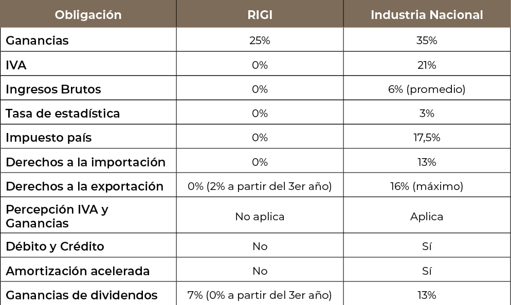 a. Reducción de la alícuota del Impuesto a las Ganancias al 25% para los Vehículos Titulares de un Único Proyecto (VPU). b. Amortización acelerada de bienes muebles e infraestructura. c. Transferencia de quebrantos impositivos no absorbidos dentro de los primeros 5 años. d. Devolución acelerada de saldos a favor de IVA en un plazo no mayor a tres meses. e. Pago del IVA a través de Certificados de Crédito Fiscal transferibles a terceros. f. Cómputo del 100% del impuesto sobre débitos y créditos bancarios como crédito en el Impuesto a las Ganancias. - Beneficios aduaneros