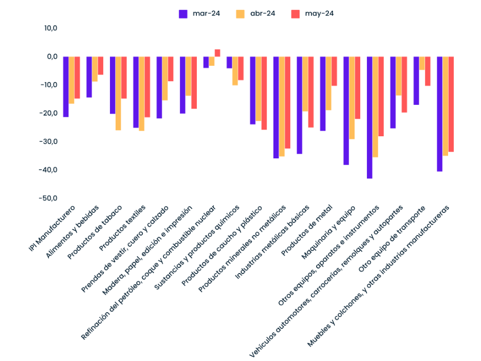 NÚMERO 21. 10 de julio de 2024 | ACTUALIZACIÓN DE VARIABLES ECONÓMICAS | ● Excepto por Refinación del petróleo, coque y combustible nuclear (+2,6% i.a.), nuevamente cayeron todos los sectores contemplados en el Índice de producción industrial manufacturero. En promedio, la industria se contrajo -16,6% i.a. en mayo, y -0,2% i.m.. El dato positivo es que al menos un sector creció, y que la caída interanual fue menor que la de abril (que fue de -16,6% i.a.), mientras que en varios sectores también se desaceleró la caída interanual (como se observa en el gráfico a continuación). La mala noticia: la caída intermensual pasó prácticamente nula en abril a -0,2% en mayo. Respecto de diciembre de 2023, la actividad industrial cayó -15,2%. | ●El sector de mayor caída interanual fue “muebles, colchones y otras industrias manufactureras”, que se contrajo -33,6% i.a., más del doble que el promedio de la industria (+18,8 p.p. por encima). Más en detalle, dentro de ese sector se contrajeron -45,5% i.a. otras industrias manufactureras y -37,4% i.a. muebles y colchones. ● Hasta la actividad en la industria minera muestra indicios de estancamiento en mayo: cayó -0,2% i.a. y el crecimiento interanual bajó a +7,7%, muy por debajo de los niveles del 2023. La industria pesquera hizo lo suyo y también cayó -16,1% i.a. en mayo. ●Los primeros datos para junio muestran tampoco dan indicios de recuperación significativa: la evolución de la actividad económica parece estancarse tras la caída inicial (es decir, “forma de L”). La tenue recuperación de la construcción en mayo (+6,2% i.m., con caída interanual de -32,6% y acumulado de 32,2% desde dic-23) sería compensada aparentemente por una recaída en junio. ● Los despachos de cemento, por ejemplo, cayeron en junio con respecto de 2023 (-32,8%) pero también respecto de mayo (-3% i.m. desestacionalizado). La misma suerte siguió la industria automotriz, en tanto la Asociación de Fabricantes de Automotores de la Argentina (ADEFA) estimó una caída intermensual de -16,7% i.m. en junio y -40,2% i.a.. El patentamiento de autos y de motos se redujo también en -25,5% i.a. y -3,7% i.a., respectivamente. | "Debemos unirnos como una cadena productiva sólida y coordinada" | En ocasión del 145° Congreso Maderero de la República Argentina, la presidenta de FAIMA, Mercedes Omeñuka, expresó la preocupación del sector. El portal especializado Noticias Agropecuarias destaca estos aspectos de su discurso: - La preocupación de los diferentes actores de la cadena foresto industrial, especialmente la industria del mueble, frente a la caída de la demanda que en líneas generales es de alrededor del 40%.