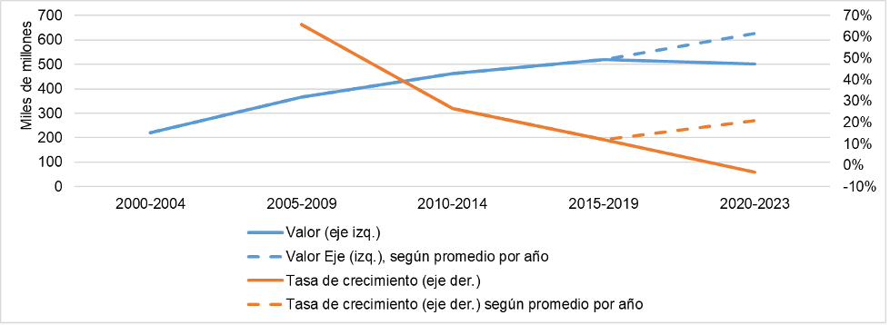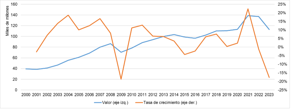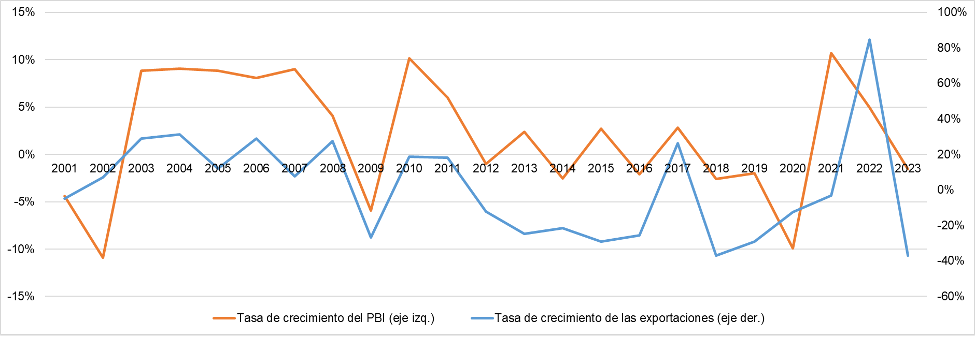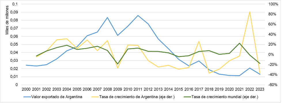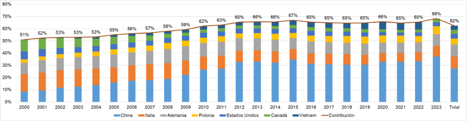 NÚMERO 22. 17 de julio de 2024 | EXPORTACIONES DE MUEBLES EN LOS ÚLTIMOS 20 AÑOS | ● Las exportaciones de muebles y sus partes se incrementaron en casi tres veces en los últimos 24 años (2000-2023). De punta a punta, el crecimiento fue de +186%. ● Si bien durante el período aumenta el volumen importado, marginalmente el aumento es cada vez menor, por lo que las tasas de crecimiento de las exportaciones a nivel mundial se desaceleran. Parece que ha comenzado una etapa de recuperación luego de la pandemia. ● De un total de 198 países exportadores durante el período, Argentina ocupó el lugar 62 entre los países de mayor contribución al total de exportaciones mundiales. Para 2023 habría ascendido al puesto 56. ● 7 países ocupan el podio de los mayores exportadores de muebles y sus partes en el mundo. De manera creciente durante todo el período, el que más exporta es China. En los últimos años también fueron ganando protagonismo Vietnam, Polonia y Alemania. Los otros países que están entre los que más exportan son Italia, Canadá y Estados Unidos. ● Argentina comparte una cualidad con los mayores exportadores de muebles y sus partes en el mundo: la evolución del PBI tiene un efecto positivo y significativo en la evolución de las exportaciones. Dicha correlación positiva le ha jugado en contra en los últimos años, ya que caídas en el PBI se han asociado con caídas en las exportaciones. ● Con las proyecciones de crecimiento del sector a nivel internacional, si Argentina continúa estancada se alejará cada vez más de la frontera de producción internacional, y más difícil será insertarse con nuevos productos en el futuro. | Evolución de las exportaciones de muebles y sus partes | Las exportaciones de muebles y sus partes han crecido ampliamente durante los últimos 20 años. Como podemos observar en el Gráfico 1 al final de este párrafo, el total exportado a nivel mundial pasó de 39.522,82 a 112.919,31 millones de dólares, lo cual refleja un aumento de +185,7%, es decir, alrededor de 3 veces más. Tal como se ve reflejado en el gráfico, el crecimiento de las exportaciones mundiales de muebles y sus partes es prácticamente contínuo en valores, y solo en pocos momentos la tasa de crecimiento es negativa: en 2001 (-2,8% i.a.), 2009 (-18,7% i.a.), 2015 (-4,3% i.a.), 2016 (-2,2% i.a.), 2020 (-1,1% i.a.) y 2022 (-17,6% i.a.). Para los 17 años restantes, la tasa de crecimiento interanual de las exportaciones es positiva y en general bastante elevada. En ese sentido, en 8 años en los que se verifica crecimiento la tasa es de 2 dígitos: +13,9% i.a. en 2003, +18,6% i.a. en 2004, +10,1% i.a. en 2005, +12,5% i.a. en 2006 +16,6% i.a. en 2007, +11,2% i.a. en 2010, +12,8% i.a. en 2011 y +22,4% i.a. en 2021. De esta manera, la tasa de crecimiento interanual promedio en los años con tasa positiva es de +9,7%, mientras que en los años en los que es negativa es de –7,8%. Como resultado, como decíamos al inicio del párrafo, las exportaciones mundiales se incrementaron entre 2000 y 2023 cerca de 3 veces. | Gráfico 1. Exportaciones de muebles y sus partes. Valor y tasa de crecimiento. 2000-2023. | Fuente: elaboración propia en base a UN Comtrade. | La desaceleración en el crecimiento de las exportaciones fue previa a la pandemia. Como podemos observar en el Gráfico 1, si bien los valores de previos a la crisis del 2009 se recuperan enseguida y se continúa un sendero de crecimiento, la tasa se desacelera hasta incluso volverse negativa en 2015 y 2016 (-4,3% i.a. y -2,2% i.a., respectivamente). Luego vuelve a subir en los dos años siguientes y alcanza su valor máximo de +22,4% i.a. en 2021, en la salida de la pandemia. Como hemos analizado en informes previos (y continuaremos en el próximo, focalizado en importaciones), pese a la caída en 2022 y 2023, actualmente la perspectiva mundial es que el comercio internacional de muebles y sus partes se incremente en los próximos años. Las proyecciones son que el volumen del mercado global de muebles (ventas al interior de los países y comercio internacional) crezca alrededor de 5,6% en 2024, en comparación con el 2023. De 2023 a 2029 la proyección es de un crecimiento de +38,4%. Al analizar la evolución de las exportaciones en lapsos quinquenales (5 años) se identifica que si bien el volumen exportado aumentó período a período, la tasa de crecimiento se estaba desacelerando, es decir que marginalmente el incremento del valor exportado fue cada vez menor. En los años 2005-2009 el volumen exportado subió +65,8% respecto de 2000-2004; en 2010-2014 se elevó +26,4% comparado con 2005-2009; y en 2015-2019 el aumento fue de +11,9% respecto de 2010-2014. Este rumbo pareciera haberse revertido con la pandemia y su recuperación. El promedio de cantidad exportada por año en el período 2020-2023 se incrementó +20,9%, en comparación con 2015-2019 (tal como lo indica la línea naranja punteada1). Esto es una tasa de crecimiento más cercana a la del período 2010-2014. Esta mejora se explica netamente por el desempeño exportador en 2021, que se incrementó +22,4% i.a. y tuvo entonces exportaciones de muebles y sus partes +33,6% por encima que el promedio del período 2015-2019. | Gráfico 2. Exportaciones de muebles y sus partes. Valor y tasa de crecimiento. 2000-2023 en períodos de 5 años. | Fuente: elaboración propia en base a UN Comtrade. | En definitiva, de 2000 a 2023 las exportaciones mundiales de muebles y sus partes se incrementaron notablemente, pero con una tendencia a desacelerarse en ese ritmo de suba. Sin embargo, sí se verifica una aceleración a partir de 2021 (principalmente por los efectos de la pandemia sobre la demanda de muebles); pese a la caída interanual de 2022 y 2023, se proyecta que esa suba se prolongue en los próximos años. Por ende el nivel de exportación mundial de muebles y sus partes continuaría elevándose en el futuro próximo, luego de expandirse casi 3 vece