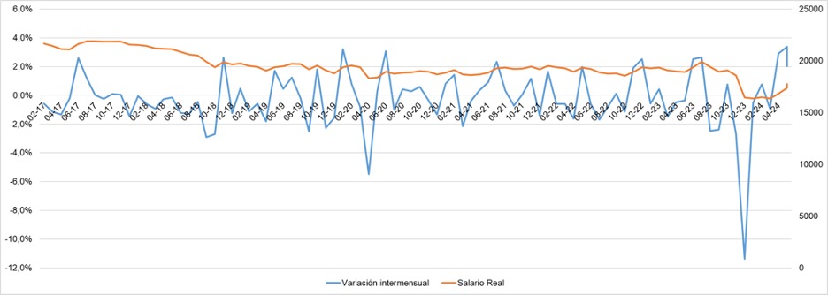 Los salarios se incrementaron +6,2% i.m. en junio y +216,3% i.a.. Los grandes perdedores fueron los/as trabajadores del sector público, con un incremento intermensual de +3,9% (-0,7 p.p. respecto de la inflación), seguidos por el sector privado registrado, cuyos ingresos subieron +6,7% i.m. y, por último, el sector privado informal, cuyos salarios se incrementaron +9,2% i.m.. No obstante, en el acumulado del año el sector privado registrado es el que lidera, y además el único que está por encima de la inflación. La primera mitad del año tuvieron un incremento de +93,6% de los salarios (+13,8 p.p. más que el IPC), mientras que el sector privado no registrado perdió en -10 p.p. respecto de la inflación (+73,3% a.i.) y el sector público perdió en -6,5 p.p. (+73,3% a.i.).