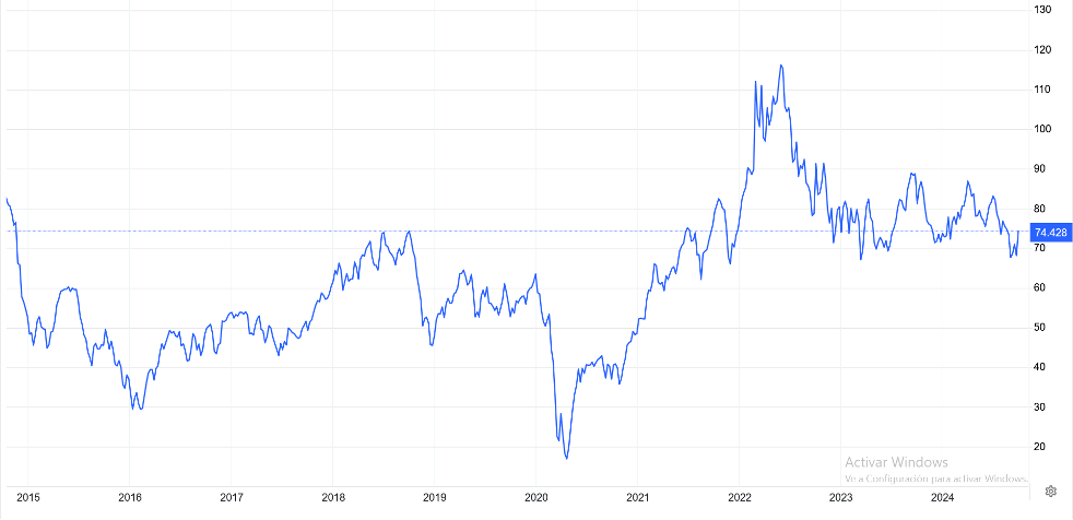 NÚMERO 34. 9 de octubre de 2024 | La crisis de Medio Oriente y su impacto en Argentina: un escenario optimista | ● Esta semana se intensificó el conflicto en Medio Oriente, entre Israel e Irán. El riesgo de una guerra más amplia en la región, tras los ataques militares de Israel contra Hezbolá y las amenazas contra la infraestructura petrolera de Irán (proveedor del 4% del crudo global), genera preocupación por eventuales interrupciones del suministro mundial de petróleo. ● Como siempre, este tipo de eventos pone los ojos del resto del mundo en el mercado financiero mundial; y tiende a apuntalar la cotización de varias commodities, primero el petróleo y gas y desde allí se deriva un aumento en el precio de los alimentos. ● Este punto, de principal interés en Argentina, nos permite mostrar uno de los posibles escenarios para 2025 que prevemos. No es el único, sino uno que podríamos calificar como muy optimista y que permite entender la apuesta de Milei y Caputo a aguantar y tender puentes hasta el año próximo. ● Hay un primer punto que es clave para que este escenario pueda existir: cumplir con el desarrollo de inversiones en infraestructura para el sector energético. Puede ser financiado por parte del Gobierno o privados, pero bajo cualquiera de esas dos formas, requiere una gestión activa de los gobiernos nacional y provinciales. La pasividad ya demostró sus problemas: un Gobierno Nacional que canceló obras energéticas para ahorrar esa plata, está teniendo que poner buena parte de ese dinero en importar energía de urgencia, porque no coordinó que fueran los privados quienes concretaran esas inversiones. Los empresarios eluden un buen negocio por esa misma pasividad histórica, pero como sociedad lo que perdemos son recursos y lo que ganamos son problemas (en este caso, energéticos). ● En efecto, de extenderse, el conflicto que involucra a uno de los principales países productores de petróleo en el globo (la República Islámica de Irán) pronostica problemas en la oferta en el futuro y por tanto un incremento de su precio. ● Ya esta semana el petróleo aumentó alrededor de +5% en Estados Unidos. Esto benefició a las acciones de las empresas argentinas del sector, tanto las que cotizan en el país como en la bolsa de Nueva York: i.e., las acciones de YPF subieron esta semana +2,2% y +2,4% en Nueva York y en el Merval, respectivamente. La cotización del crudo podría trepar +10% como consecuencia del conflicto, si se sostiene. | Precio del barril de petróleo WTI, en dólares estadounidenses, 2014-2024