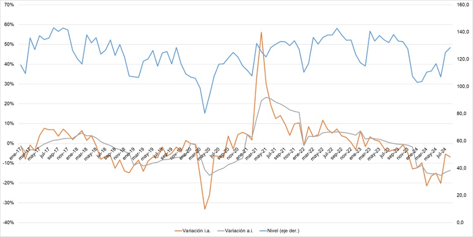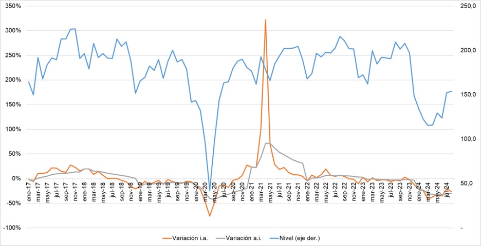 NÚMERO 35. 16 de octubre de 2024 | Las razones del veranito financiero | ●¿Hasta cuándo durará este veranito financiero, cuya evolución es totalmente contraria al nivel de actividad (como analizamos en la segunda parte de este informe)? ● La demasiado moderada acumulación de reservas, contrapartida de las políticas que promueven la baja de los dólares paralelos, enciende algunas alarmas. En septiembre, las reservas netas fueron negativas por USD 6.400 millones. ●Uno de los componentes que compensa en gran parte la caída de las reservas netas es el carry trade doméstico, a través de deuda en dólares del sector privado, que a la vez genera un incremento de la oferta de dólares en el Mercado Libre de Cambios (MLC). El problema es que esas deudas son de corto plazo (a un año), a la vez que los deudores tienen derecho a acceder al MLC para pagarle a los acreedores. Es decir, en algún momento el efecto positivo del endeudamiento privado en dólares en las reservas netas se va a revertir, mientras que los ingresos por saldo comercial o inversión productiva no están teniendo grandes efectos (y, por la apreciación cambiaria, cada vez pierden más atractivos para entrar). ● A la vez, si el mercado comienza a desconfiar del actual esquema de crawling de 2% mensual, la reversión de esas reservas acumuladas por inversión especulativa no solo se puede adelantar, sino que desde que inicie puede convertirse en un proceso que se retro-alimente, como ya ha ocurrido en otros momentos de la historia argentina. ● De esta manera, una clave para el sostenimiento de este esquema es sostener expectativas de devaluación bajas. Para ello es fundamental que la política anti-inflacionaria comience a tener una visión más amplia. La vía monetaria por sí sola se agotó en niveles de inflación de entre 3% y 4%, como venimos anticipando. | Datos actualizados de coyuntura | El nivel de actividad sigue sin mostrar el tan ansiado rebote. La industria manufacturera cayó -6,9% i.a. (en julio había caído -5,4% i.a.) y subió +1,5% i.m. (en julio había crecido +7,2% i.m.). De nuevo, Alimentos, bebidas y tabaco mostró en agosto una mejora interanual (+1,4% i.a.), aunque a nivel acumulado cayó en el año -5% a.i., por debajo de todo el sector manufacturero, que acumula una caída de -13,6% a.i. Entre los sectores de evolución positiva se sumaron también Refinación del petróleo, coque y combustible nuclear (+12,4% i.a.), Otro equipo de transporte (+9% i.a.) y Prendas de vestir, cuero y calzado (+2,9% i.a.). En 10 sectores la caída interanual de la actividad todavía es de dos dígitos: Productos minerales no metálicos (-22,2% i.a.), Maquinaria y equipo (-19,2% i.a.), Madera, papel, edición e impresión (-17,8% i.a.), Productos de caucho y plástico (-13,9% i.a.), Vehículos automotores, carrocerías, remolques y autopartes (-12,5% i.a.), Industrias metálicas básicas (-11,0% i.a.), Productos de metal (-10,6% i.a.), Otros equipos, aparatos e instrumentos (-10,5% i.a.), Curtido y artículos de cuero, excepto prendas (-10,3% i.a.), y Productos textiles (-10,2% i.a.). Para el sector de Muebles y colchones, y otras industrias manufactureras el dato de agosto es algo más alentador: luego de 8 meses consecutivos de caída interanual a dos dígitos en agosto la caída se desaceleró, a -8,1% i.a.. No obstante, acumula 15 meses consecutivos de caída interanual. Entre los subgrupos, Muebles y colchones es el menos afectado en el mes de agosto (-5,8% i.a.). | Índice de producción industrial manufacturero. Variación interanual y acumulada interanual y nivel. Ene-17a ago-24. | Fuente: elaboración propia en base a INDEC. | El sector de la construcción es otro de los más afectados en la crisis actual. A diferencia de la industria manufacturera, tuvo una evolución negativa intermensual de -2,9% i.a. en agosto, luego de 4 meses consecutivos de evolución en verde. A nivel interanual la caída también se aceleró, de -20,2% i.a. en julio a -26,4% i.a. en agosto. De esta manera, en todo el año acumula una caída de -30,3% a.i. Los puestos de trabajo registrados en el sector de la construcción fueron afectados por la crisis: se redujeron en -17,3% i.a.. | Indicador de la actividad de la construcción. Variación interanual y acumulada interanual y nivel. Ene-17a ago-24. | Fuente: elaboración propia en base a INDEC. | Como novedad, la industria minera también se sumó a cierto amesetamiento. Cayó en agosto por segundo mes consecutivo a nivel intermensual (-1,6%), y el doble que en el mes anterior. A nivel interanual sigue mostrando una evolución positiva, de +2,1% i.a.; y en el año acumula un alza de +6,9% a.i.. Finalmente, los servicios públicos tuvieron una evolución positiva tanto intermensual (+2,1% i.m.) como interanual (+0,5% i.a.) en julio. Los precios sí mostraron un resultado muy positivo. El IPC se desaceleró a +3,5% intermensual en septiembre; bajó a +209% i.a. y en el año ya acumula más de 100% (+101,6% a.i.). Pero la inflación núcleo se mantiene en +3,3% i.m., lo que da cuenta de las dificultades de continuar perforando el nivel actual de inflación en los próximos meses. La mayor suba fue en Vivienda, agua, electricidad, gas y otros combustibles, que más que duplicó el índice promedio (+7,3% i.m.), de manera que los precios regulados fueron los de mayor aumento (+4,5% i.m.). La división con menor variación fue recreación y cultura (+2,1% i.m.). En esta línea, las canastas básicas subieron en mucha menor medida que el IPC. La canasta básica alimentaria se encareció +1,7% i.m. y +189,9% i.a., por lo que en el año subió 78,1% a.i. La canasta básica total, a su vez, se incrementó +2,6% i.m. y +202% i.a., y lleva un acumulado de +94,6% a.i. en el año. Así, la línea de indigencia fue de $138.744 en septiembre y la de pobreza, $312.175. Para una familia tipo el ingreso mínimo para no ser indigente fue de $428.720 y para no ser pobre de $964.620. | Ch