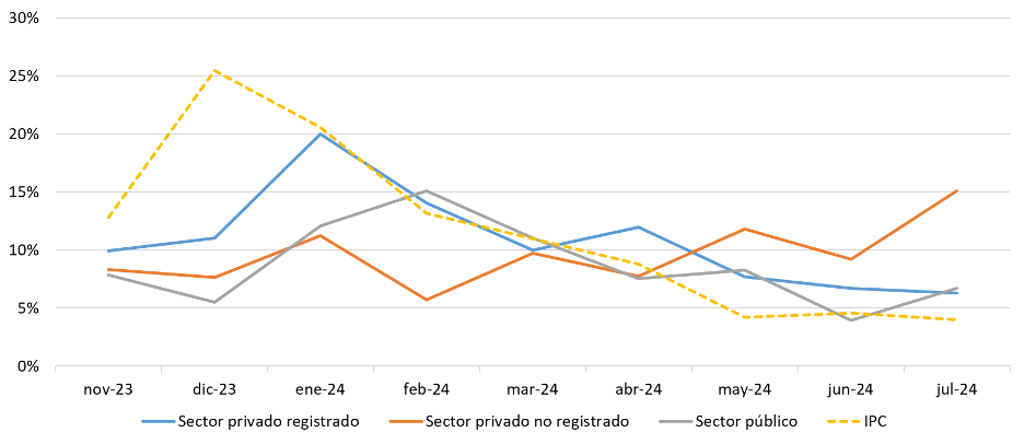 NÚMERO 36. 23 de octubre de 2024 | Ronda de Negocios Sectorial FAIMA 2024 | El Ministerio de Producción, Ciencia e Innovación tecnológica de la provincia de Buenos Aires, la Federación Argentina Industria Maderera y Afines (FAIMA) , en conjunto a la Secretaría de Producción y Desarrollo Económico del Municipio de San Martín y la Escuela de Economía y Negocios de la UNSAM invitan a participar a la "Ronda de Negocios Sectorial FAIMA 2024" 🗓️ Jueves 31/10 - 9:00 Hs. 📝Inscríbete en: cutt.ly/rondaFAIMA2024 📍Lugar: UNSAM - AULA TANQUE - Ingreso peatonal por Av. 25 de mayo y Francia - San Martín 🔒Cierre de inscripción: Jueves 24/10 Nuestro objetivo es posibilitar el intercambio entre las empresas participantes, iniciar contactos comerciales y/o institucionales y así incentivar la creación de un escenario propicio para la concreción de negocios, representaciones y todo aquello que impulse la competitividad de las PyMEs y grandes empresas relacionadas a la actividad maderera y afines. ¡Los esperamos! | Piso inflacionario difícil de perforar | ●A principios de septiembre se oficializó la baja del Impuesto País a las importaciones en 10 puntos, de 17,5% a 7,5%. Uno de los propósitos del gobierno (al reducir un impuesto que al inicio de su gestión había incrementado) era contribuir a desacelerar la inflación. ● La evolución de los precios mayoristas le da cierta razón al gobierno en esa decisión. El Índice de precios internos al por mayor bajó en 0,1 punto porcentual en septiembre y se ubicó en +2% i.m. (+2,1% i.m. en agosto) y +197,3% i.a. ● La evolución mensual de los precios de productos nacionales apenas subió (de +2,2% i.m. a 2,3% i.m. en agosto y septiembre, respectivamente), pero los precios de productos importados pasaron de una evolución baja en agosto (+0,2% i.m.) a una negativa en septiembre, de -1,4% i.m.. ●Entre los precios de productos nacionales, el de mayor aumento fue la energía eléctrica: +4,2% intermensual en septiembre (había sido +5,7% i.m. en agosto). Este mayor incremento relativo del costo de la energía (incluso en comparación con el IPC de +3,5% i.m. en septiembre) sigue poniendo un piso a la inflación de los próximos meses, en tanto impacta sobre los costos de los sectores productivos y los salarios reales. Por eso el gobierno repite una táctica que ya usó en mayo pasado (y que el gobierno de Alberto Fernández implementó continuamente): posponer los aumentos de tarifas energéticas. ● En la construcción, por ejemplo, el índice de precios subió +4,9% i.m. en septiembre, muy por encima del +1,6% i.m. de agosto. En gran medida se debió al aumento del costo de la mano de obra, que comenzó a compensar la fuerte pérdida de los primeros meses del año: se elevó +8,2% i.m.. Los costos generales fueron el segundo componente de más aumento, +5,8% i.m.; incluyen la energía eléctrica. Los materiales, por su parte, subieron +1,7% i.m. ●Confiar en que la desaceleración de la inflación no requiere medidas adicionales sería un poco ingenuo, así como el uso del IPC para medir la evolución de los salarios reales es algo impreciso. ● En lo que va de 2024 (hasta septiembre inclusive) los precios en promedio se elevaron +102%. Casi al doble de aumento está vivienda, agua, electricidad, gas y otros combustibles. Es decir, los precios regulados (y algunos desregulados, como los alquileres) subieron muy por encima de la inflación promedio. | Evolución acumulada anual del IPC general y por divisiones (sept-2024). | ●Por debajo del promedio general hay bienes que sin embargo vieron retroceder sus niveles de ventas y consumo, como prendas de vestir y calzado y restaurantes y hoteles. Esto resulta de una menor disposición de los ingresos para este tipo de bienes porque hay una mayor proporción destinadas a aquellos que tuvieron mayores aumentos; también, de que algunos de esos bienes son caros en la comparación internacional de precios (como pasa con buena parte de los textiles). ● En el caso de la industria mueblera, el aumento de los precios mayoristas fue de +1,6% i.m. en noviembre, 0,4 p.p. por debajo del índice promedio y 0,6 p.p. por debajo de los productos manufacturados (para este grupo el índice fue +2,2% i.m.). A nivel interanual la evolución también es menor, comparada con ambos casos: el índice promedio fue de +197,3% i.a., con la manufactura un poco por encima, con una variación de +198,4% i.a.; en cambio, en el sector mueblero la variación de los precios fue de +146,2% i.a.. A nivel acumulado, en el sector mueblero la inflación anual fue de apenas +22% a.i., mientras que para los bienes manufacturados y para el índice promedio fue alrededor del triple (+62% a.i. y +61,5% a.i., respectivamente). Todo esto refleja que el sector mueblero es uno de los más afectados por la crisis, en tanto los precios reales cayeron durante este año por la caída en la demanda, a la vez que ambos factores afectan las tasas de ganancia del sector. ● Los ingresos no recuperan todavía lo perdido durante los primeros meses del gobierno. En los últimos meses, no obstante, comenzaron a “empatar” o superar la evolución mensual del IPC. ● Si se da un proceso, aunque gradual y paulatino, de evolución positiva de los ingresos es probable que permita recomponer precios a los sectores que actualmente están conteniendo algo de su inflación de costos. Un ejemplo es la construcción (que puede generar impacto similar en el sector de muebles), cuya inflación estuvo por debajo de la general durante 2024 (en septiembre la evolución interanual fue de +169,6%), pero en septiembre se ubicó por encima del IPC mensual. ● La actual política de desinflación no es sustentable si continúa basada en la contención de dos precios clave como son el tipo de cambio y los salarios; y en la recesión productiva. | Evolución mensual de los ingresos y del IPC. | ● El ancla cambiaria es una herramienta lógica, h