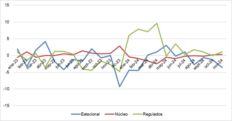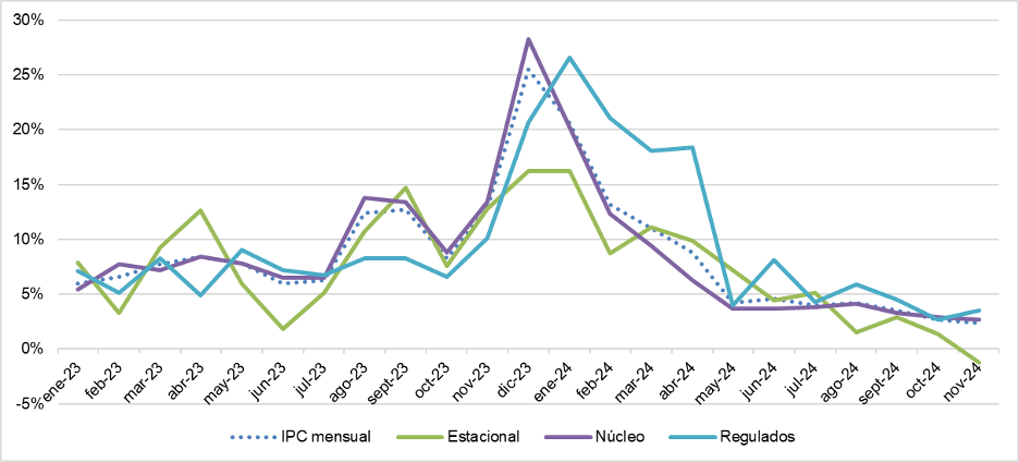 | ● Otro punto alentador es que la inflación núcleo se redujo a +2,7% i.m.. En la serie histórica siempre está en valores muy cercanos al nivel general, lo que quiere decir que difícilmente anticipa la inflación de mediano plazo. Más aún, la desaceleración de la inflación durante la gestión de Milei está siendo mayormente traccionada por la menor variación de los precios estacionales, que durante 2023 habían tenido una evolución más cíclica. | Inflación por categoría y nivel general. Ene-23 a Nov-24. Variación intermensual (%) | Fuente: elaboración propia en base a INDEC.