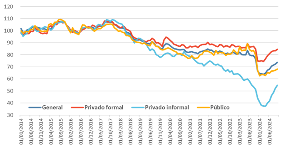 NÚMERO 47. 8 de enero de 2024 | INFORME DE COYUNTURA ECONÓMICA Y POLÍTICA | La paradoja de los ingresos y el consumo | ● Los últimos datos económicos sorprendieron a parte del mercado y llevaron a un debate dentro de la economía y las finanzas sobre si toda esta información es coherente entre sí. En particular, la mayor duda empresaria es cómo se conjuga que en los últimos meses de 2024 hayan subido los salarios y bajado la pobreza pero no se haya recuperado el consumo masivo. ● Según el INDEC, en octubre el salario se recuperó un 4,6% intermensual (contra 2,7% de inflación), apuntalado por un 7,7% de mejora en los salarios privados no registrados (informales). En los primeros diez meses del año, la suba de salarios fue de 129% acumulado interanual, con el salario privado no registrado en punta (157%), el privado registrado detrás (133%) y el público como gran perdedor (109%), frente a una inflación acumulada interanual de 249%. ● Es claro que todos los ingresos laborales perdieron poder adquisitivo a lo largo de 2024. Pero esa contracción se concentró en la primera mitad del año y luego la evolución fue suficientemente dispar como para que en el segundo semestre muchas familias puedan sentir que “lo peor quedó atrás” y al menos recuperaron sus niveles salariales de fines de 2023. ● En efecto, si sólo comparamos octubre de 2024 contra octubre de 2023, los salarios aumentaron 172% en promedio; mientras que la inflación fue de 193%. Ahora bien, los trabajadores privados informales elevaron sus ingresos en un 199%, por lo cual este grupo de hecho tiene hoy mejores salarios que a fines de 2023; y los privados registrados en un 185%, lo cual los deja a las puertas de empatarle a la inflación interanual en noviembre o diciembre. No es el caso de los empleados públicos, cuyo salario aumentó apenas 139% - 54 puntos porcentuales menos que la inflación-. | Evolución real de los salarios en Argentina desde 2014 | Fuente: elaboración propia en base a INDEC | ● A la vez, también hay cierto traspaso de trabajadores entre categorías: más de 200.000 personas perdieron empleos privados registrados y pasaron al privado no registrado, lo cual implica que se incorporan a este último conjunto trabajadores con ingresos relativamente mayores, que aportan a elevar el promedio y así suben (por única vez) su tasa de aumento. ● La recuperación reciente en el poder adquisitivo de los salarios apenas alcanza los niveles que se tenían hasta 2023 -o ni siquiera eso, especialmente para los empleados públicos que son además por mucho los más perjudicados por la política económica desde 2019-. Es además algo esperable: cualquier proceso de des-inflación implica una aceración inicial (para acomodar precios relativos) que tiende a reducir los ingresos reales de las familias, para luego comenzar a recomponerse a medida que la inflación se desacelera y permite que los salarios recuperen terreno. La contracara de este mismo argumento sirve para entender el fracaso “en votos” de los Gobiernos anteriores: una inflación que se aceleraba continuamente generaba una dinámica en la que los salarios estaban siempre “a la defensiva” mientras la necesidad de gastar los pesos con urgencia pervertía las rutinas diarias de cualquier familia. ● Así como no aumentan demasiado los salarios públicos, tampoco aumentan las transferencias del Estado a los hogares: jubilaciones y pensiones, gasto en tarifa social de servicios públicos, programas sociales con o sin contraprestación laboral. Excepto la Asignación Universal por Hijo, todas las transferencias a los hogares se derrumbaron en términos reales en el primer semestre del año; y también tendieron a estabilizarse en la segunda mitad. ● Esto es particularmente relevante si se considera que desde octubre de 2023 la jubilación mínima no alcanza para cubrir la línea de pobreza para una persona adulta mayor de 65 años. Es decir que un hogar cuyos ingresos sean únicamente jubilaciones mínimas son pobres desde fines de 2023 y sin chances de salir de la pobreza a futuro, dado que las jubilaciones actualizan por inflación y por lo tanto están condenadas a mantener el nivel posterior al ajuste inicial hecho por Milei. Como sociedad, estamos definiendo que esas personas mayores dependen de seguir trabajando o de que alguien en su familia pueda darles una mano, para no ser pobres. ● Recordemos: en Argentina casi 6 millones de personas cobran una jubilación, lo cual equivale al 94% de las personas en edad de jubilarse. De ese total, el 64,5% son mujeres; el 63% se jubiló a través de alguna moratoria previsional (46% de los varones y 79% de las mujeres). Del total de personas que cobran una jubilación, el 16% cobra el haber mínimo (o menos): es decir, 1,1 millón de personas hoy son pobres si no cuentan con alguna ayuda o siguen trabajando. ● Más allá de la situación previsional, la suba de ingresos laborales explica parte de la reducción en la pobreza: son hogares que con un poco más de ingreso que hace unos meses, quedan levemente por encima del costo de la Canasta Básica Total y por ende no son más pobres. ● La segunda parte del fenómeno a entender: si los ingresos de una parte importante de los hogares están aumentando, ¿por qué no se recupera el consumo masivo? ● En términos reales los autoservicios mayoristas en octubre de 2024 vendieron 23% menos que en octubre de 2023 y lo mismo que en octubre de 2022. En supermercados se vende 18% menos que en octubre de 2023 y 12% menos que en octubre de 2022. ● Para entender esto, hay dos cuestiones clave: una es recordar que a fines de 2023 hubo un aumento inusitado en las ventas de supermercados (mayoristas y minoristas), una “sobre acumulación” por parte de las familias que superó incluso picos como el de marzo de 2020 en los inicios de la pandemia de COVID-19. Eso hace que la comparación interanual de este fin de 2024 esté relati