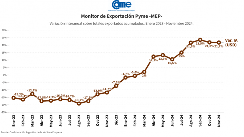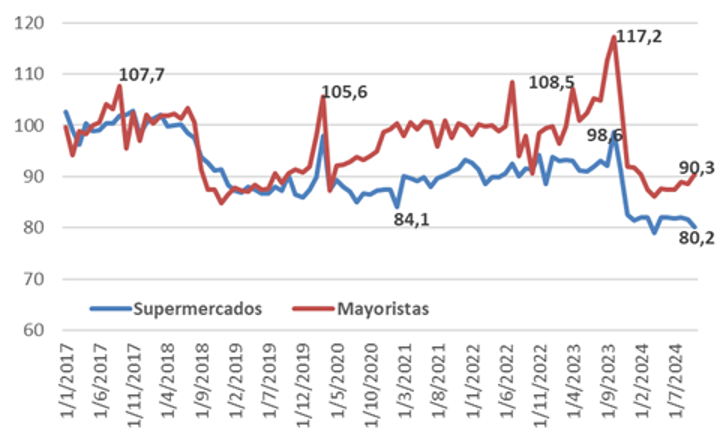 ● En definitiva, el aumento real de los ingresos -que se concentra en el sector privado- se contrapone con una caída real del ingreso disponible. Si bien varios ingresos familiares se recuperaron para dejar de ser “de pobreza” 1, aún siguen ajustados por los gastos fijos. ● Todo esto resuelve en gran parte la paradoja de incremento de los ingresos reales sin aumento del consumo masivo. En realidad, el consumo masivo está cohibido por el aumento de los pasivos y del gasto fijo y porque los ingresos familiares no se recompusieron plenamente. El factor predominante de la caída del consumo es, en definitiva, la caída de los ingresos reales disponibles. ● El siguiente paso de un proceso de desinflación es mejorar los ingresos reales, fenómeno que comenzó en los últimos meses pero que aún se queda muy corto: los ingresos familiares están por debajo de los de hace un año, muy por debajo del promedio de la última década, y más por debajo que en la primera década de este milenio. | Actualización de variables económicas | Hasta ahora los dólares paralelos se mantienen, mientras que el riesgo país sigue cayendo (ya debajo de los 600 puntos) y las acciones y bonos extienden racha alcista. El dólar oficial subió +24,3% de punta a punta en el año, mientras que el CCL se incrementó +12,3% (con algunos incrementos y retrocesos hacia mediados y finales de año). Por otra parte, el BCRA continúa con una estrategia de ingresos de divisas para mantener la estabilidad cambiaria (y macroeconómica). Mientras avanza con una nueva negociación con el FMI, comenzó los acuerdos en los mercados internacionales de créditos. El día viernes el BCRA concretó una licitación por USD 1.000 millones a un plazo de 2 años y 4 meses con 5 bancos internacionales en el marco de una operación de pase pasivo (REPO) con títulos BOPREAL Serie 1-D. La tasa de interés es de 8,8% fija anual, compuesta por la tasa SOFR-USD y un spread (adicional por riesgo) de 4,75%. Desde el BCRA se interpreta la operatoria como todo un éxito: lanzada la licitación el 27 de diciembre, tuvieron ofertas de hasta USD 2.850 millones, número por encima de las necesidades de financiamiento según la entidad. Un costo de 4,75% de hecho implica un “riesgo país” menor a los 610 puntos, aunque debe considerarse que el BCRA tiene siempre un menor nivel de riesgo que el Tesoro argentino y eso por sí mismo explica la “menor” tasa de interés. En su comunicado el BCRA reafirma su compromiso con la estabilidad cambiaria, así como las expectativas positivas de los bancos internacionales, lo cual “afianza el proceso de normalización en el acceso a los mercados internacionales de crédito”, a la vez que es resultado de -y contribuye a- la baja del riesgo país. También está el componente productivo: la disponibilidad de divisas permite mejoras en la cadena de producción (sin interrupciones por escasez de divisas), a la vez que contribuye a continuar con el sendero que se plantea el gobierno, hacia la eliminación por completo de las restricciones cambiarias. Queda aún la incertidumbre acerca de cuándo será dicha eliminación. La contracara de dicha negociación es que se debe financiar ese 8,8% de interés, y para ello se necesitarán nuevos ingresos de divisas. Más allá de cierta “prueba” de que los bancos le prestan efectivamente dólares, ¿por qué tomar esos USD 1.000 millones ahora, si no hay aparentemente urgencia para usarlos, en lugar de esperar e intentar obtener una tasa de interés menor? 2024 fue un año positivo para las PyMEs en materia de comercio exterior, lo cual permitió compensar -al menos en parte- la caída del consumo local. Según CAME, la mayor disponibilidad de saldos exportables se tradujo en un aumento acumulado del ingreso por exportaciones de +21,7% entre enero y noviembre de 2024, mientras que el incremento en toneladas fue algo mayor (+27,5%, 7,9 millones de toneladas), lo cual refleja un leve descenso en los precios (-4,5%, equivalente a USD -1.174 millones). En total, en esos 11 meses las empresas PyMEs exportaron el 12,4% del total exportado en el país (USD 9.234 millones). Ahora bien, en términos de cantidad de empresas, el 71,2% de las exportadoras son PyMEs. | Evolución real desestacionalizada de las ventas de supermercados y autoservicios mayoristas | Fuente: elaboración propia en base a INDEC | Respecto de la evolución sectorial, durante los primeros 11 meses del año, cuatro sectores (de un total de dieciséis) registraron caídas, con Tabaco y derivados a la cabeza (-30,8%). Manufacturas diversas lideró el crecimiento en valor (+1.266%), y Petróleo y combustibles se destacó por el incremento en volumen (+117%). Asimismo, las PyMEs argentinas concentraron el 50% de sus exportaciones en Alimentos sin procesar. En lo que refiere a los destinos, Sudamérica fue el principal destino de las exportaciones de las PyMEs argentinas en 2024, representando el 33,1% del total (USD 3.060,9 millones). Dentro de la región, Brasil y Chile fueron los principales socios comerciales (USD 1.926,4 millones en total). Europa ocupó el segundo lugar, principalmente Países Bajos, España e Italia, concentrando el 24,3% de las exportaciones (USD 1.038,8 millones). En términos generales, hubo una alta concentración de exportaciones en pocos mercados clave: solo 30 países concentraron más del 87% de las operaciones. Así, la evolución de las exportaciones de las empresas PyMEs durante 2024 reconfirma un problema estructural largamente estudiado en la historia económica argentina, y también analizado en este espacio: existe una fuerte necesidad de reconversión productiva hacia bienes y servicios de mayor valor agregado, contenido tecnológico, diseño y, por lo tanto, diferenciación. La necesidad de exportar mayor volumen en una mayor proporción refleja que la canasta exportadora de estas empresas se compone de bienes que van perdiendo competitividad, lo cual e