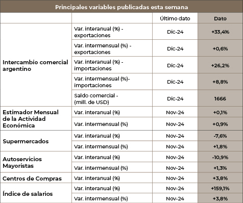 ● Además, para los productos de economías regionales (azúcar, algodón, cuero bovino, tabaco, foresto industria, arroz, entre otros) las retenciones se eliminan de manera permanente. ● Las retenciones actúan como reguladoras de los precios nacionales versus su cotización internacional: los productos exportables se venden en el mercado local a precio internacional descontada la retención. Por ende, la baja de las retenciones impactará directamente en una suba (por única vez, en principio) de los precios de los alimentos. Mientras el gobierno busca sostener su política cambiaria para desacelerar la inflación, la quita de retenciones hace el efecto contrario. ● El impuesto PAIS hubiera recaudado el 1,4% del PIB de no haberse eliminado durante este año. Esta nueva baja en las retenciones suma unos USD 800 millones de menor recaudación fiscal durante los 4 meses previstos para 2025, según la propia estimación del Gobierno; eso implica más de 0,1% del PIB adicional de costo fiscal. ● Así el gobierno pretende endurecer su política de superávit fiscal (primario y financiero) a la vez que elimina fuentes de ingresos. Aunque algo de mejora habrá también por la recuperación (gradual y oscilante) de la actividad, esto reconfirma nuestras previsiones de mayor ajuste en el gasto durante 2025; más allá de algún ingreso extraordinario por privatizaciones. ● En definitiva, es una medida que reduce los ingresos del fisco y de las familias, a la vez que incrementa las ganancias de las firmas exportadoras - sin ninguna garantía, desde ya, de que las productoras reciban en su precio de venta algún derrame de esa mayor ganancia exportadora -. También altera los incentivos al interior de la cadena de valor de estas mercancías: reduce el diferencial de alícuotas de retenciones entre productos de más valor agregado y de menos valor agregado. Esto es un desincentivo al agregado de valor en el territorio nacional. ● Para el Gobierno es también una señal de que necesita dólares con cierta urgencia, incluso cediendo recursos fiscales a cambio de que la liquidación de divisas ocurra antes. Esta necesidad se trasluce también en que la medida anunciada incluyó problemas de implementación graves. Con un análisis técnico riguroso o un diálogo previo con el sector exportador, estos problemas de implementación se hubieran prevenido antes del anuncio oficial. ● En definitiva, el endurecimiento del ancla cambiaria como política antiinflacionaria y el superávit financiero le permiten al Gobierno tomar una medida que aumentará el precio de algunos alimentos y que reducirá sus ingresos fiscales. ● También es un mensaje del gobierno para sus votantes: en este caso, un sector agroexportador que en diciembre a través de la SRA había anunciado que se le acababa la paciencia con las retenciones. Se complementa con otras acciones para conservar a su electorado de cara a las elecciones. | Fuentes: INDEC y Ministerio de Economía de la Nación. | En diciembre de 2024 las exportaciones volvieron a mostrar un desempeño destacado: alcanzaron USD 7.035 millones (+33,4% i.a.). Estuvieron impulsadas principalmente por las manufacturas de origen agropecuario (34,6% del total, con un incremento interanual del +36,7% i.a.) y las manufacturas de origen industrial (31,5%, con un alza del +26,4% i.a.). Los productos primarios también registraron un crecimiento significativo del +32,6% i.a., pero representaron el 19,3% del total exportado. Los combustibles y la energía subieron +43,6% i.a. (14,7% de participación). En cuanto a las importaciones, totalizaron USD 5.369 millones (+26,2% i.a.). Los bienes de capital representaron el 20,1% del total, con un aumento interanual notable del +84,9% i.a.. Destacó también el crecimiento de los vehículos automotores de pasajeros (7,3% del total, con un salto de +230,9% i.a.) y de los bienes de consumo (+53% i.a., con una participación de 14,6%). Los combustibles y lubricantes cayeron un 42,9%, de igual manera que los bienes intermedios, que descendieron un -2,6% i.a.. El saldo comercial cerró con un superávit de USD 1.666 millones y el intercambio comercial total alcanzó los USD 12.405 millones (+30,2% i.a.). En relación con la actividad, en noviembre de 2024 el Estimador Mensual de Actividad Económica (EMAE) mostró un crecimiento marginal de +0,1% interanual y de +0,9% respecto a octubre en términos desestacionalizados. El dato es positivo: desde mayo que el indicador no mostraba mejora interanual (5 meses) y consolida 7 meses de mejora intermensual. El sector de Pesca lideró el crecimiento interanual con un incremento de 164,6% i.a., seguido por Intermediación financiera (+9,9% i.a.); mientras que Construcción (-14,2% i.a.), Electricidad, gas y agua (-5,6% i.a.) e Industria manufacturera (-2,3% i.a.) siguen siendo los de las caídas más significativas. La Intermediación financiera fue el sector con mayor incidencia positiva en la variación interanual, compensando parcialmente las contracciones en Construcción, Industria manufacturera y Comercio, que en conjunto restaron un punto porcentual a la variación del EMAE. Según CLAVES, la venta minorista de bazar, decoración, textiles de hogar y muebles por parte de PyMEs se contrajo -9,4% i.a. en diciembre de 2024, pero mostró una mejora intermensual de +7,8%; lo cual la ubica por encima de Ferretería, materiales eléctricos y construcción (+1,9% i.m.), Farmacia (+2,6% i.m.) y Calzado y marroquinería (+3,4% i.m.). En lo respectivo al comercio, en los supermercados la caída interanual de las ventas bajó a 1 dígito (-7,6% i.a.), a la vez que tuvo una mejora intermensual de +1,8% i.m.. No obstante, la caída acumulada al mes de noviembre de 2024 alcanza una variación de -11,9% a.i.. Así, el personal ocupado cayó -1,3% i.a.. En los autoservicios mayoristas la tendencia fue similar: la caída acumulada al mes de nov-24 fue de -15% a.i., la interanual de -10,9% i.a., a la v
