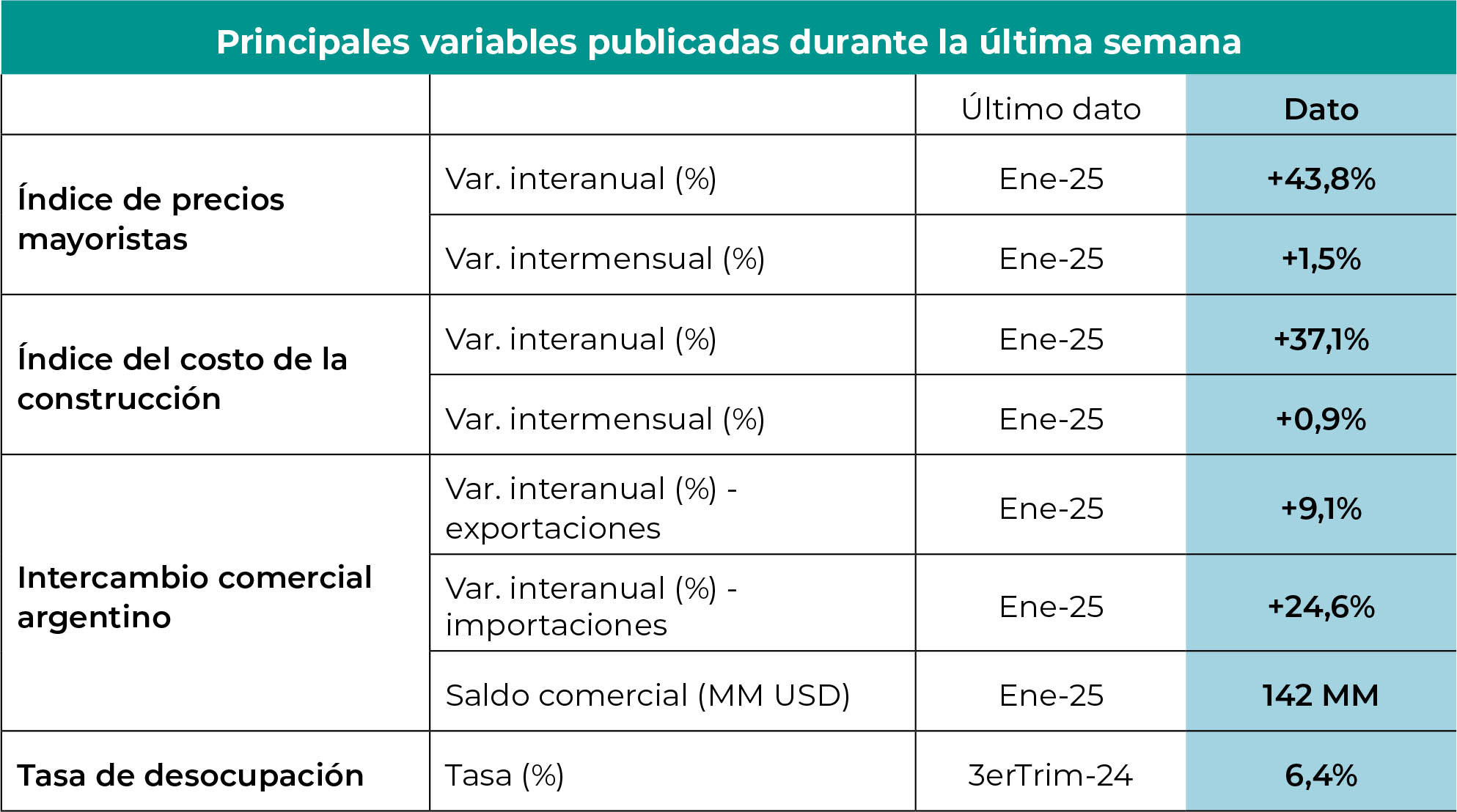 NÚMERO 54. 26 de febrero de 2025 | INFORME DE COYUNTURA ECONÓMICA Y POLÍTICA | Importaciones, intervenciones y cepos cambiarios | ● En enero y lo que va de febrero, la intervención del BCRA en los mercados paralelos de dólares están en niveles récord - incluso por encima de los de Macri o Fernández, por un amplio margen si se incluye el dólar blend -. En estos meses, el principal motor es el turismo emisivo, tal como anticipamos desde sep-2024; y la percepción de un “dólar barato”. ● No obstante, también tienen su peso los bienes. No es casualidad que las importaciones crezcan muy por encima de las exportaciones. Luego de 22 meses consecutivos de caída interanual (desde feb-22 hasta nov-24), las importaciones se recuperaron con fuerza: habían subido +26,2% i.a. en diciembre de 2024 y en enero sostuvieron una tasa similar (+24,6% i.a.). Las exportaciones en enero subieron +9% i.a. Desde luego, se comparan con los peores meses de los últimos años, pero aún así es claro que las importaciones comienzan a tomar fuerza de la mano de la incipiente recuperación económica, del atraso cambiario, de la eliminación del Impuesto PAIS y de una Aduana que agilizó trámites y/o dejó de controlar algunas importaciones. El saldo comercial se redujo -81,9% i.a. en enero. ● En efecto, se siguen incrementando en gran medida las importaciones de bienes finales (+47,5% i.a.) encima de, por ejemplo, los bienes intermedios (+10,6% i.a.), lo cual indica que la leve recuperación de los salarios reales se está sesgando hacia la adquisición de bienes importados en lugar de aquellos que son de origen nacional. Asimismo, también se incrementaron fuertemente las importaciones de bienes de capital (+52,8% i.a.), por lo que pareciera que ciertas empresas están aprovechando la coyuntura para invertir en modernización tecnológica. ● Ahora bien, el dólar barato continuará profundizándose durante 2025, si el Gobierno cumple su promesa. Como en todo año electoral, es esperable una dolarización de carteras mayor que la que hay en los años pares. Ya hemos analizado en este espacio en los meses pasados el mayor saldo exportador que tendrán los sectores minero y energético (que superó en el último año los USD 6.000 millones de superávit comercial). Pero el Gobierno depende de manera excesiva de que la cosecha agropecuaria mejore perspectivas y de que el FMI (o alguien) le refinancie sus deudas a pagar. En este escenario, Milei necesita que le entren al menos USD 20.000 millones. Para eso no alcanza con que el FMI simplemente refinancie los vencimientos de 2024 (aunque no sería menor), acuerdo que debería ser factible de alcanzar. ● Tampoco alcanzará con el RIGI, que por ahora dio pocos frutos: un solo proyecto aprobado, ningún dólar ingresado. Las inversiones extranjeras por otros medios tampoco llegan: las privatizaciones se demoran (IMPSA es la única que, aunque mal vendida, avanzó) y licitaciones como las de la hidrovía se frustran por falta de transparencia. ● Hasta ahora, Milei no ha podido mostrar grandes logros en materia de financiamiento externo. Ni sus vínculos cercanos con líderes de derecha a nivel mundial (de los cuales él saca un rédito personal, pero no derivan en beneficios para Argentina), ni los contactos de Caputo entre fondos financieros que al final no estaban listos para prestarle al país, ni el sobrecumplimiento del ajuste fiscal y monetario exigido por el FMI generaron que entren al país dólares frescos. ● El efecto del blanqueo quedó atrás y la salida por goteo de depósitos bancarios en dólares es una tendencia clara. Lograr algún tipo de ingresos de dólares resultará clave para un año electoral donde (por decir un ejemplo ficticio pero no improbable) cada encuesta que muestre un mal resultado de LLA en PBA significará una zozobra en la demanda privada de divisas. ● En este sentido, el BCRA eliminó una restricción para que los bancos den créditos en dólares: ahora pueden prestarle divisas extranjeras también a empresas con origen en ON o créditos desde del exterior, independientemente del sector de actividad de la firma. Con esta medida, el BCRA podrá continuar acumulando Reservas Internacionales, a medida que sigan aumentando esos préstamos privados en dólares (que las empresas siguen estando obligadas a liquidar y pasar a pesos). Ojo: más allá del rédito de corto plazo que le saque el Gobierno, este cambio regulatorio era un pedido reiterado de los bancos privados en los últimos tiempos. ● Desde este escenario se entienden frases como las que muy recientemente pronunció Milei en un evento del BID en Washington (improvisado en pocos días y casi sin presencia de miembros del BID, más allá de su Presidente Ilan Goldfajn): “Es falso que tenemos que salir del cepo para crecer”. En 2025, esto se entiende justamente porque el cepo y las intervenciones del BCRA serán la garantía de que los tipos de cambio no fluctúen demasiado. Pero Argentina no crecerá en el mediano plazo si no puede normalizar sus operaciones con el resto del mundo, eliminando el cepo y recuperando un nivel adecuado de regulación cambiaria macroprudencial. | Fuentes: INDEC y Ministerio de Economía de la Nación. | La tasa de inflación de los precios mayoristas volvió a ubicarse en enero de 2025 por debajo de la tasa del índice de precios al consumidor (+2,2% i.m.). En efecto, tomando como referencia al Índice de precios internos al por mayor, los precios mayoristas se incrementaron +1,5% i.m. y +43,8% i.a., tirados a la baja por la menor evolución de los precios de los bienes importados (+0,5% i.m.) en relación con los de producción nacional (+1,6% i.m.). Si se considera el Índice de precios básicos al por mayor, el incremento intermensual fue de +1,6%, empujado principalmente por la Energía eléctrica (+3,6% i.m.) y los productos primarios (+2,3% i.m.). El índice de precios de los Muebles y otros productos industriale