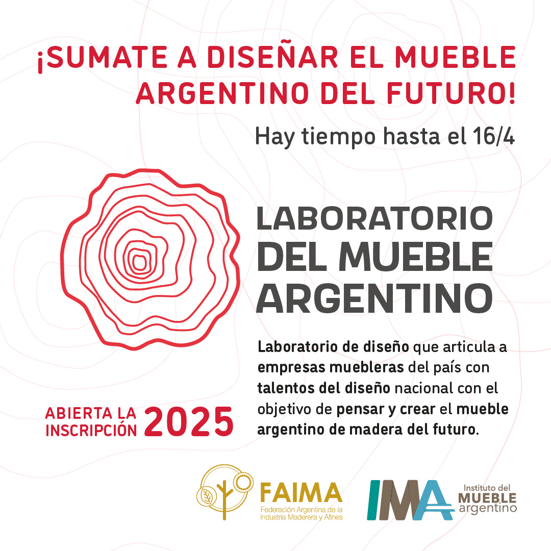 El Laboratorio del Mueble Argentino busca diseñar el mueble argentino de madera del futuro, y está organizado por la Federación Argentina de la Industria Maderera y Afines (FAIMA), y el Instituto del Mueble Argentino (IMA). Esta iniciativa articula a empresas muebleras del país con talentos del diseño nacional, con el objetivo de pensar, crear y ejecutar productos y sistemas de productos utilizando madera como material principal.