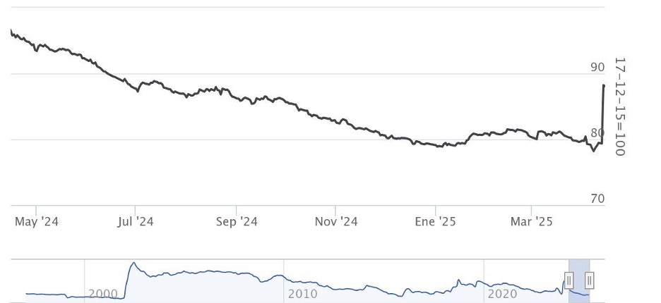 Al 16 de abril de 2025, el tipo de cambio real multilateral se encuentra en el mismo nivel que tenía en julio de 2024. Sólo hay tres momentos, después de la salida de la Convertibilidad, en que estuvo más bajo que ahora: al final del segundo gobierno de CFK, en los últimos meses del de Alberto Fernández y en los últimos nueve meses (julio 2024-marzo 2025). | Índice de Tipo de Cambio Real Multilateral