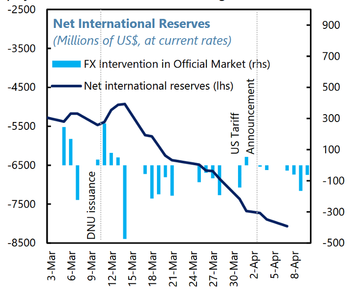 Además, el acuerdo con el FMI impone metas trimestrales de acumulación de Reservas netas: el BCRA tenía a mediados de marzo (según la metodología del FMI) USD - 4.900 millones (negativas), que empeoraron a -5.600 al 27 de marzo y USD -8.000 millones al 7 de abril. | Reservas Internacionales Netas del BCRA (metodología FMI)