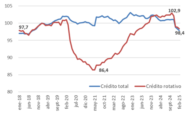 y perjudica tanto las decisiones de consumo como las de inversión. | Crédito total y rotativo en Estados Unidos, desestacionalizado y deflactado por IPC, base enero de 2019 = 100. |
