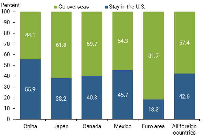 Porcentaje del precio de venta que queda en Estados Unidos o es apropiado en el extranjero, según el origen de la mercancía | Fuente: Galina Hale, Bart Hobijn, Fernanda Nechio, and Doris Wilson (2019), “How Much Do We Spend on Imports?”. FRBSF Economic Letter, 2019-01, Federal Reserve Bank of San Francisco. |