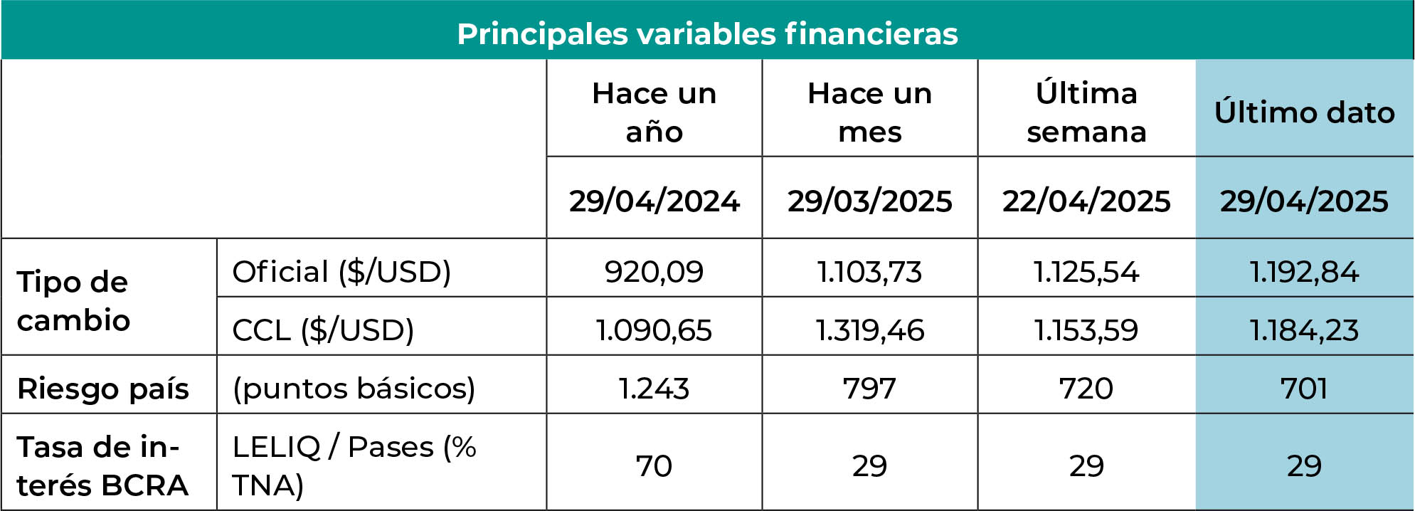 como no comprar divisas (para acumular Reservas) antes de que toque el piso de esa banda cambiaria, la reducción temporal de retenciones a las exportaciones agrícolas (hasta el 30 de junio), el incentivo al carry trade y la flexibilización del acceso al mercado cambiario para inversores extranjeros. En paralelo, el tipo de cambio CCL subió $/USD 1.184. La reducción de la brecha entre el dólar oficial y el CCL, que se ha mantenido en torno al 2%, es clave por contraste con niveles superiores al 20% en períodos anteriores.